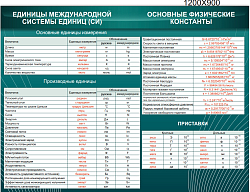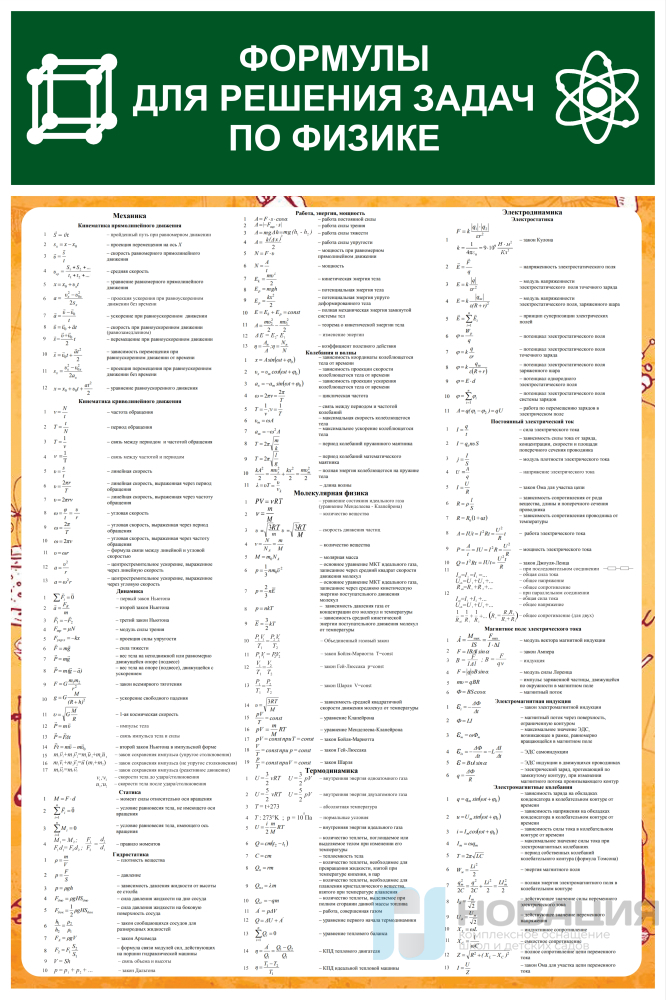 Стенд содержит формулы, которые используются для решения задач в различных разделах физики. Может использоваться как подсказка во время проведения уроков.