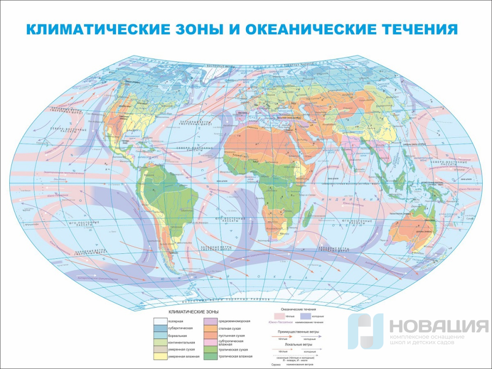 На стенде изображена карта мира, на которой указаны географические пояса и зоны суши Земли, а также приведены условные обозначения.