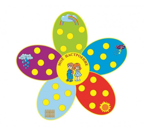 Стенд для уголка настроения представлен в виде цветка. На каждом из лепестков изображен условный знак: радуга, забор, туча, гроза, солнце. При помощи символов ребенок может выразить внутреннее состояние. Панель оснащена 30 магнитными элементами (57х100 мм) каплевидной формы. К ним крепятся фото детей, которые ассоциируют свое настроение с выбранным символом.