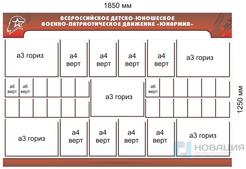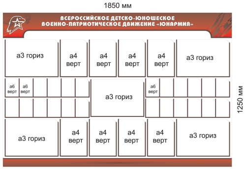 Стенд посвящен военно-патриотическому движению “Юнармия”. Карманы предназначены для размещения фотографий, информации об истории, целях и задачах движения.