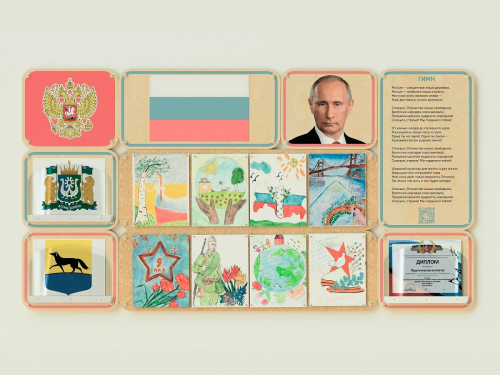 Стенд позволяет изучить основную символику РФ: герб, флаг, гимн. В пустых карманах можно размещать важную информацию: символику родного региона, фотографии выдающихся личностей и прочее.