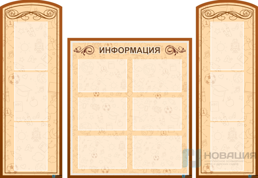 Набор состоит из 3-х резных досок для объявлений или списков. Центральная сопровождается заголовком "Информация". На ней 6 горизонтальных карманов. Боковые стенды без заголовков, каждый с 3-мя вертикальными карманами. Прорези облегчают замену содержимого.