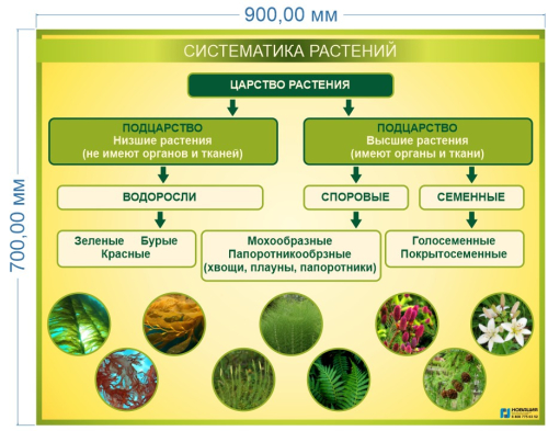 На стенде наглядно изображена классификация царства растений, его разделение на подцарства и виды.