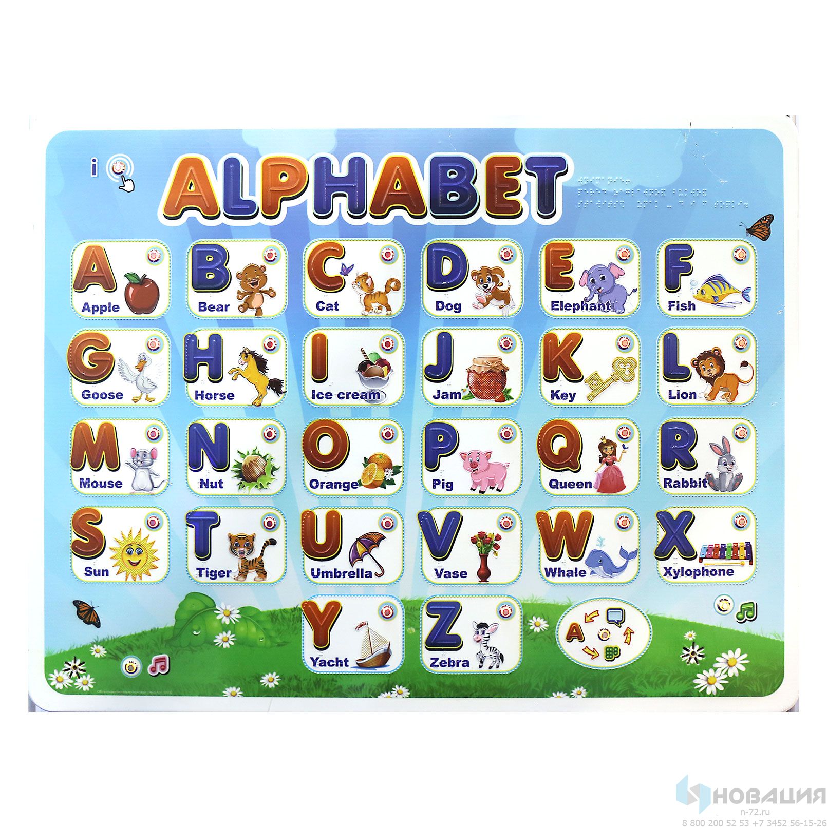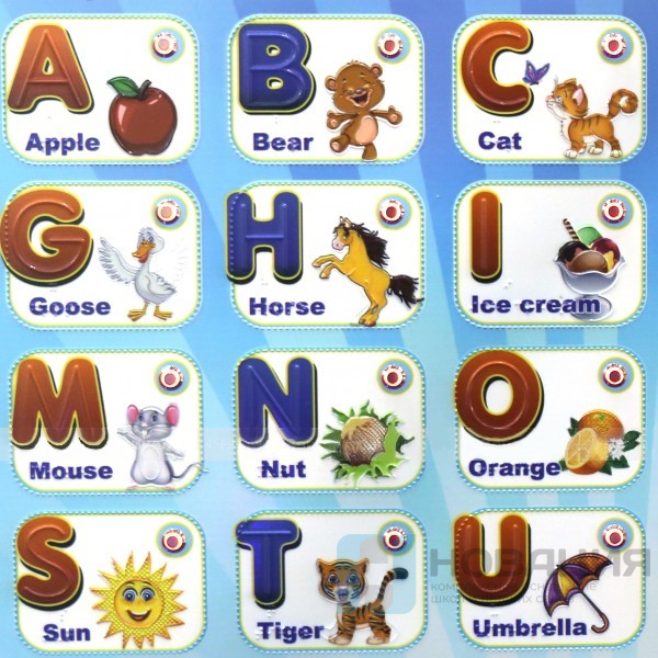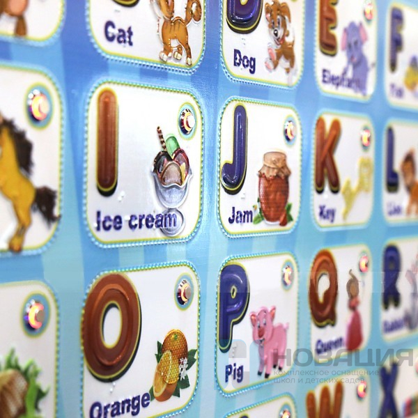 Крупные изображения букв разделены тактильным пунктиром. Рядом размещено изображение объекта, название которого (на английском языке) начинается с данной буквы. Надписи дублируются на языке Брайля.