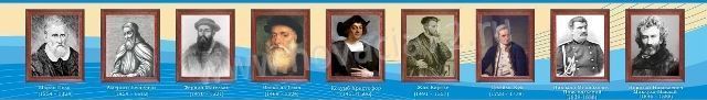 На стенде представлены портреты девяти самых популярных и выдающихся ученых, совершивших великие открытия в области географии.