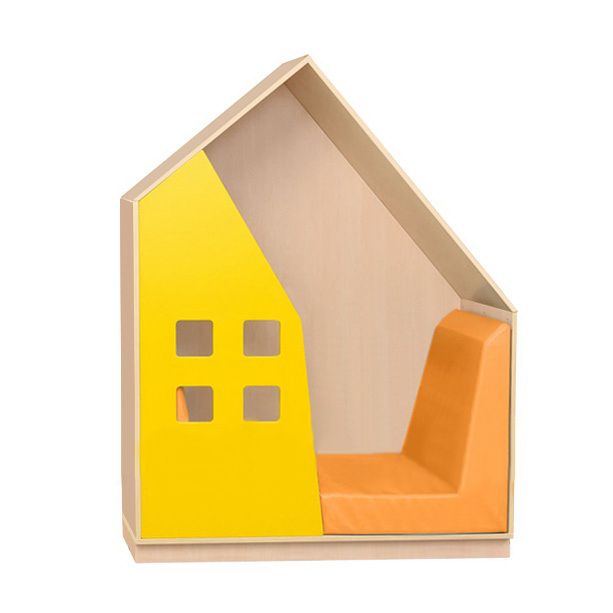 Конструкция на устойчивом основании выполнена в форме домика. Под 2-скатной крышей устанавливаются 2 мягких дивана. Невысокие сиденья оснащаются спинками. Лицевую сторону домика наполовину прикрывает фигурная панель с прорезями-окошками.