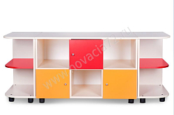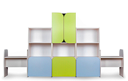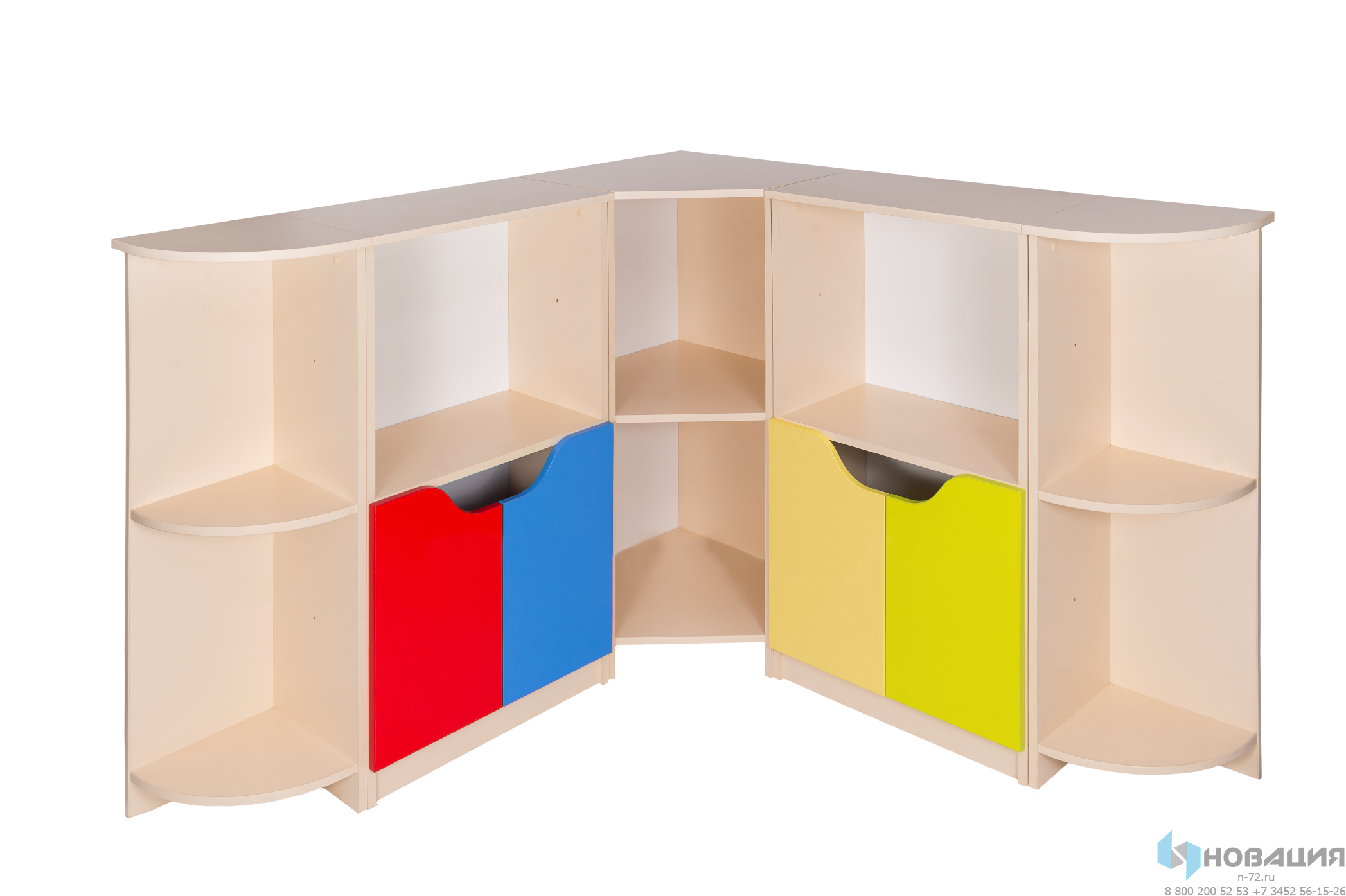 На полках угловой стенки расставляются игрушки, книги, канцелярия, учебные наборы. Мебель состоит из 3-х отдельных частей, в каждой по 2 яруса. Отделения полуоткрытые и закрытые (2 шт., внизу). Топ используется как рабочая поверхность. Цветные 2-створчатые дверцы оснащены вырезами вместо ручек.