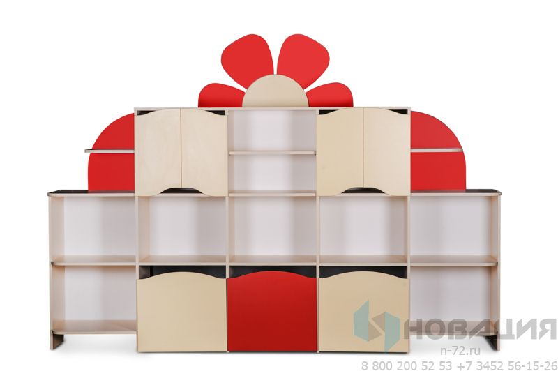 Стенка "Лето" с 3-мя выкатными ящиками и множеством открытых полок используется в детском саду (для хранения игрушек и дидактических пособий). Верхние отделения дополнены 2-створчатыми дверцами и фигурными панелями.
