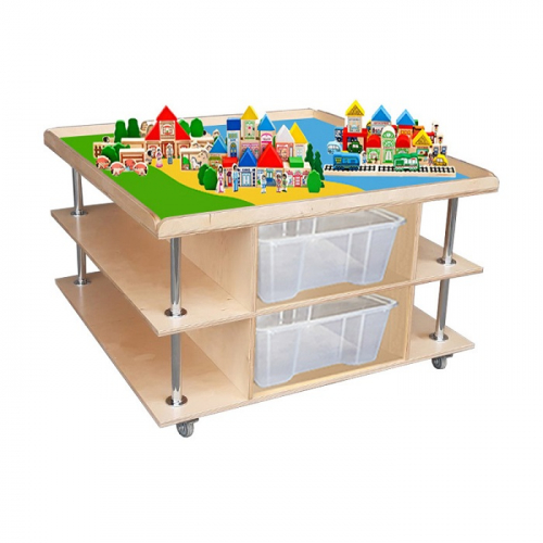 Дидактические столы для ДОУ и начальной школы оснащены полками с контейнерами. Игровые наборы можно хранить внутри стола в закрытых емкостях, что является практичным современным решением. Благодаря колесным опорам столик с легкостью перемещается из одного кабинета в другой. Стопорный механизм помогает фиксировать мебель во время игр.