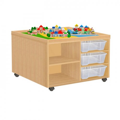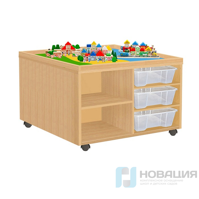 Изделие выполнено из качественных материалов, оснащено колесиками со стопорным механизмом. Стол легко перемещается и надежно фиксируется на время игры. Укомплектован контейнерами для хранения наборов.