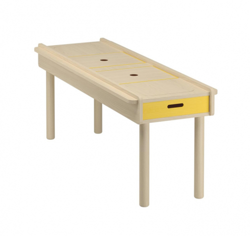 Конструкция представляет собой удлиненный стол с 4 дополнительными элементами: два выдвижных ящика в торцах и 2 ящика-углубления с крышками в центральной части.