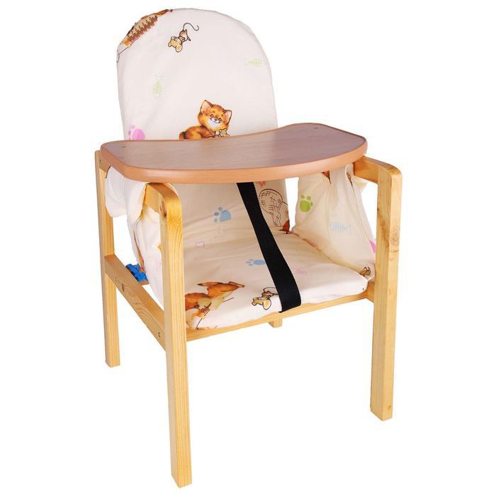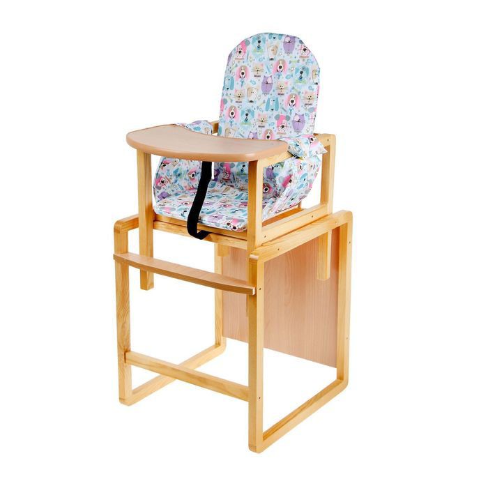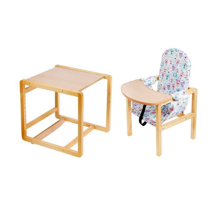 Мебель-трансформер используется во время кормления. Конструкция быстро собирается. Мягкое сиденье оснащено подлокотниками и страховочной лентой, покрыто съемным чехлом. Высота стула фиксируется в 2-х положениях. Столик для кормления дополняется столом для игр.