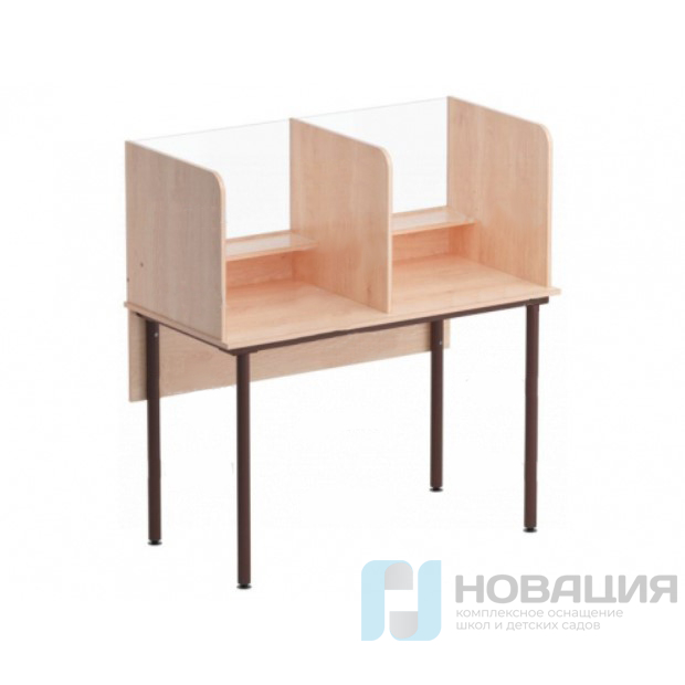 Стол рассчитан на двух учеников. Кабинки выполнены из ЛДСП, торцевые части облицованы ПВХ-кромкой. Передняя стенка стола изготовлена из стекла. Стол оснащен отверстиями для прокладки проводки с выходном на рабочую поверхность.