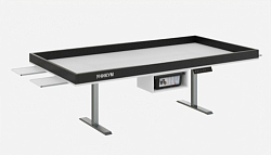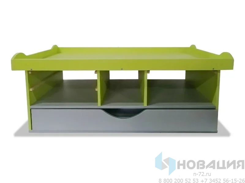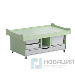 Стол предназначен для работы с конструкторами. Высокие бортики с закругленными углами предотвращают падение мелких деталей. Под столешницей расположены открытые полки для хранения, в нижней части конструкции - ящик с дверцей.