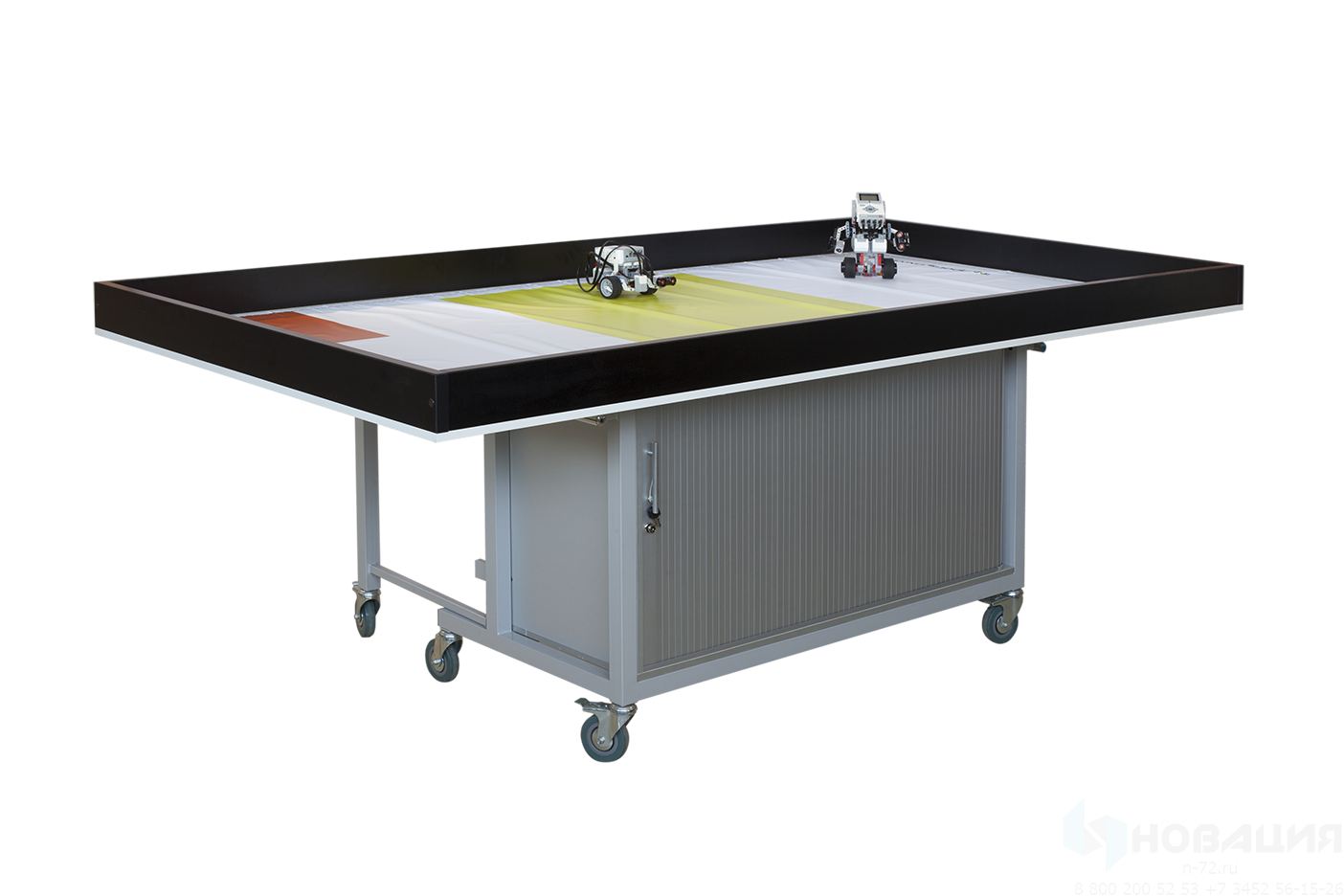 Компактный стол предназначен для использования во время проведения занятий по робототехнике (например, при сборке конструкторов LEGO Mindstorms). На его прямоугольной поверхности с высокими бортами удобно тестировать модели: размер соревновательного поля — 2640х1260 мм. Полки открытого и закрытого типа служат для хранения наборов и документации.