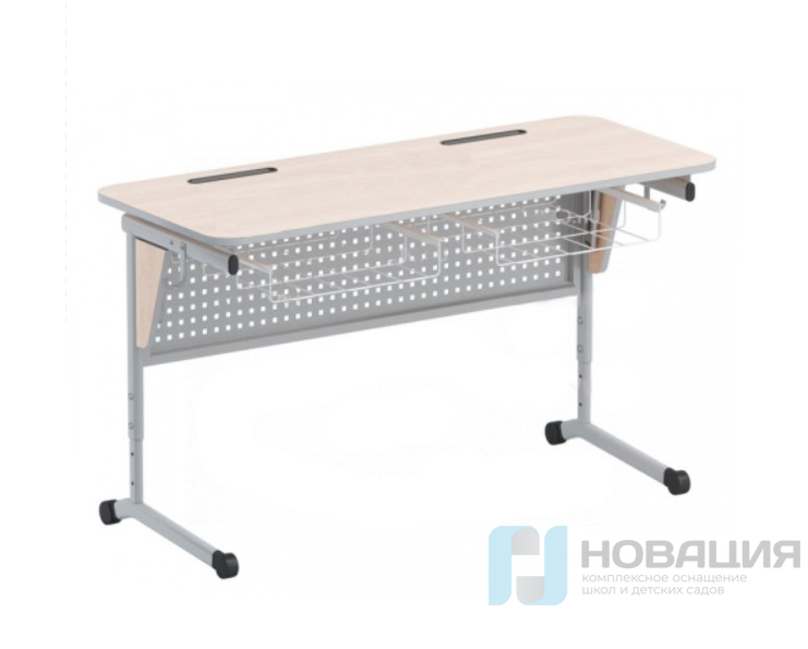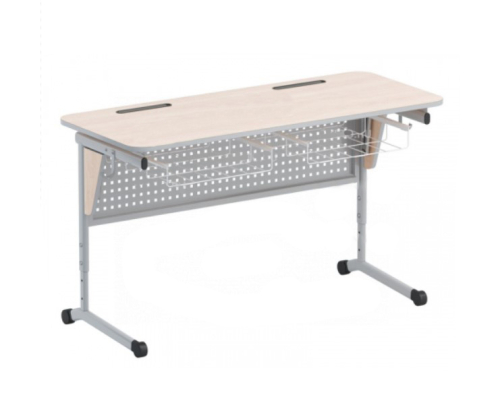 Стол рассчитан на двух учеников и регулируется по высоте под 3, 4 и 5 ростовые группы. Наклон столешницы также регулируется в пределах от 0 до 24 градусов. На рабочей поверхности есть выемка для канцелярских принадлежностей. На опорах предусмотрен крючок для портфеля, а под столешницей 2 металлические корзины для принадлежностей.