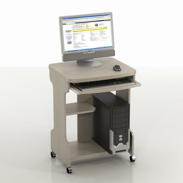 Углы столешницы закругляются. Мебель для техники оборудуется 4-мя колесиками. Между фигурными боковыми стенками предусматривается 3 сквозных отделения. Вертикальный отсек подходит для системного блока. Другая половина пространства под столешницей делится на 2 части горизонтальной полочкой. Дополнительная полка для клавиатуры выезжает на роликовых направляющих.