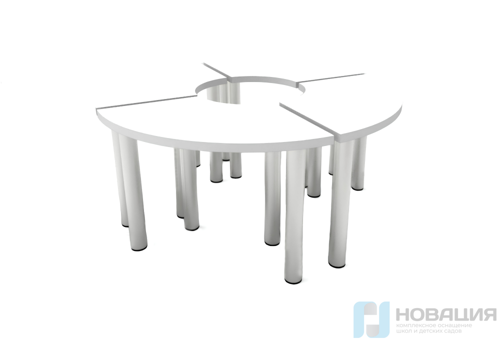 Комплект столов для проекта "ТР" составляется из 4-х модулей. Каждый модуль оборудуется каркасом с серыми металлическими ножками и подпятниками. D ножки составляет 40 мм. Части столешницы изготавливаются из 2-слойного ЛДСП, соединяются в круг. По центру композиции из вырезов образуется окружность.