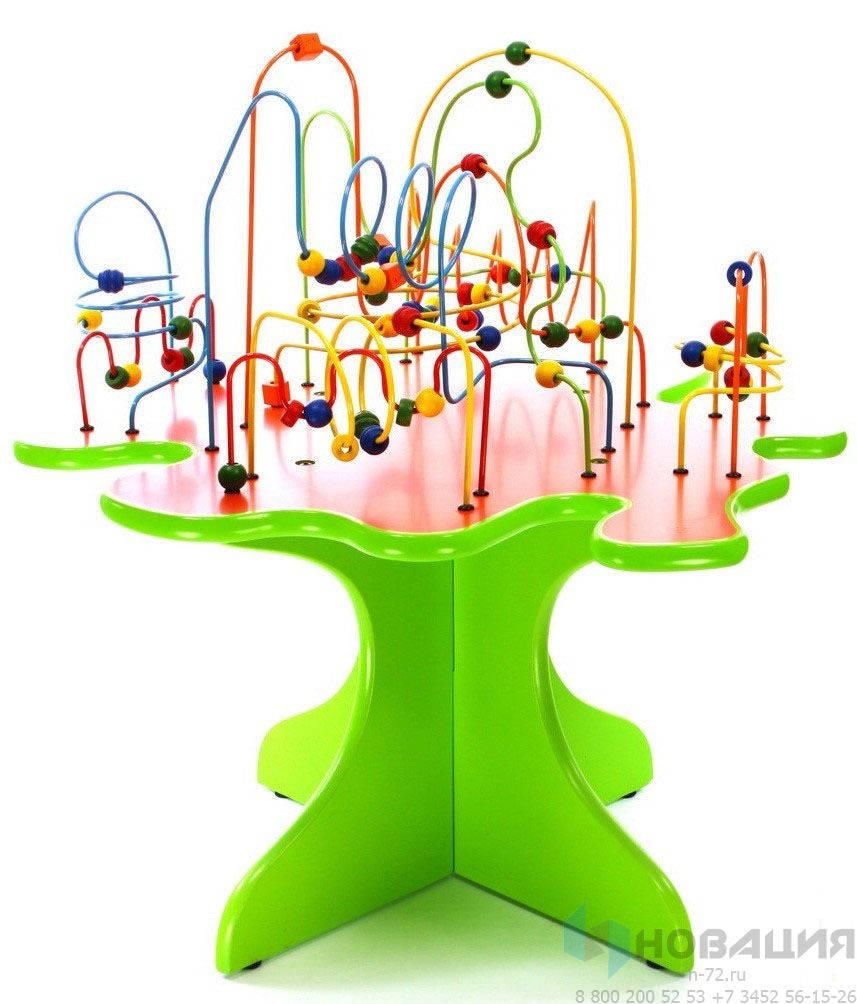 Дидактическое пособие для детей дошкольного возраста представляет собой фигурную столешницу на 4-х подставках-ножках, оснащенную лабиринтом с запутанными изогнутыми направляющими, по которым скользят элементы-бусинки. Композиционно стол с бусинами напоминает дерево, на котором растут ягоды.