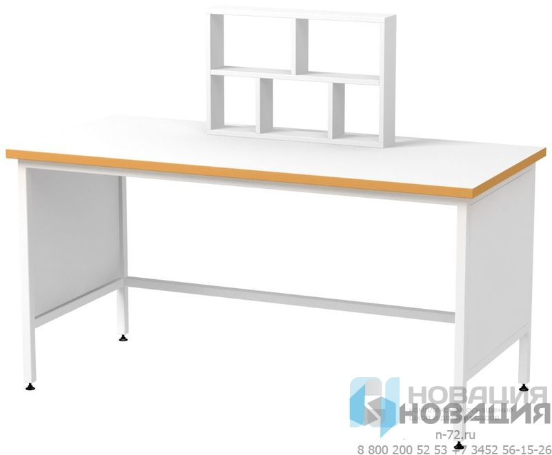 Столешница изготовлена из ламината (ДСП с термостойким пластиком). Поверхность готова к воздействию влаги и химических веществ. Рабочее место дополнено стеллажом со сквозными отделениями для чашек Петри.