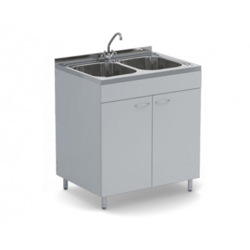 Конструкция состоит из мойки-столешницы с защитным экраном от брызг, тумбы с двумя дверцами, смесителя, сифона и гибкой подводки. Мойка изготовлена из нержавеющей стали, корпус - из ЛДСП.