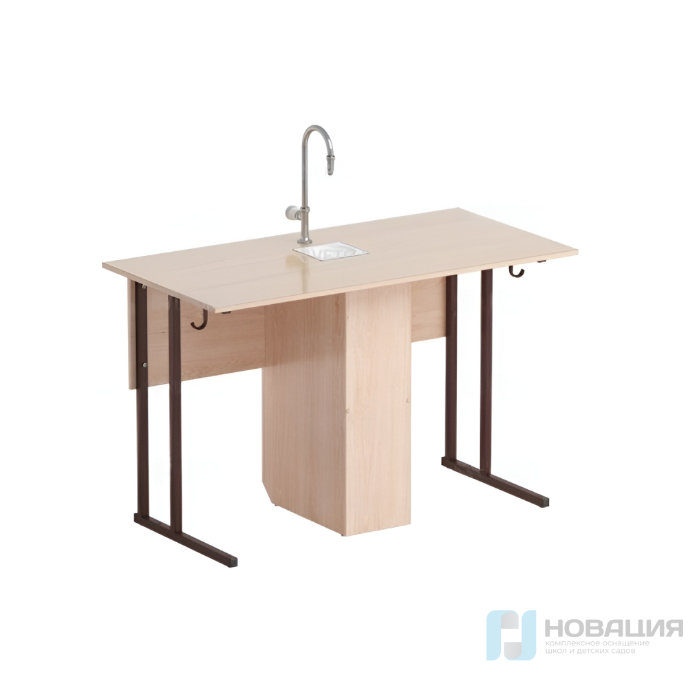 Стол оснащен тумбой под сантехнику, водоразборной колонкой и сливной раковиной. Есть два крючка для сумок и портфелей.