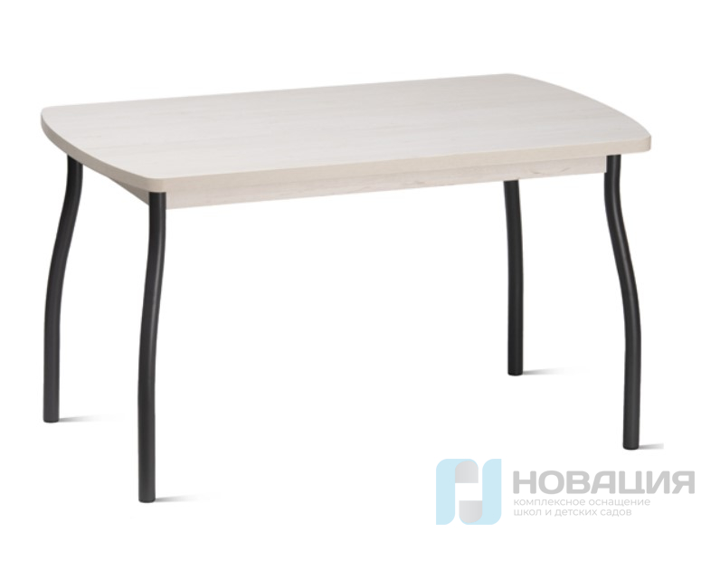 Столешница изготовлена из ЛДСП, края облицованы ПВХ-кромкой. Острые углы скруглены. Ножки выполнены из круглой стальной трубы и имеют выгнутую форму. Концы ножек оснащены пластиковыми заглушками.
