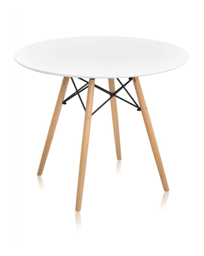 Мебель для зоны приема пищи представлена 4 ножками из цельного массива дерева и круглой столешницей. Толщина столешницы составляет 10 мм. Ножки натурального цвета закрепляются под углом, усиливаются крестообразными подпорками из металла. Дизайн стола визуально преображает общественное пространство и  сочетается с функциональностью изделия.