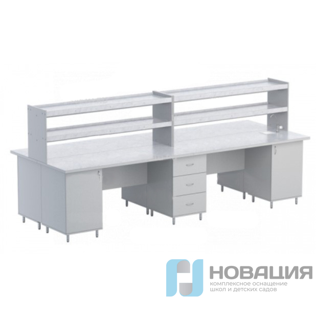 Стол имеет щитовидную конструкцию. Состоит из четырех столешниц, двух надстроек с двумя полками, четырех тумб с распашными дверцами и вкладными полками, двух центральных тумб с выдвижными ящиками и четырех соединительных панелей для тумб. На одной из столешниц размещается лабораторная раковина с краном для холодной воды.