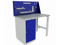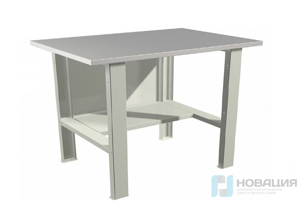 Рабочий стол изготовлен из прочного металла, что обеспечивает ему надежность и долговечность. Подходит для кабинетов технологии в школе и мастерских. Состоит из столешницы, прочных металлических опор, защитной стенки и полки.