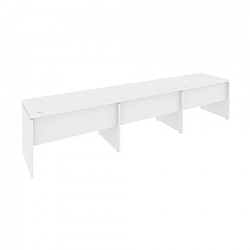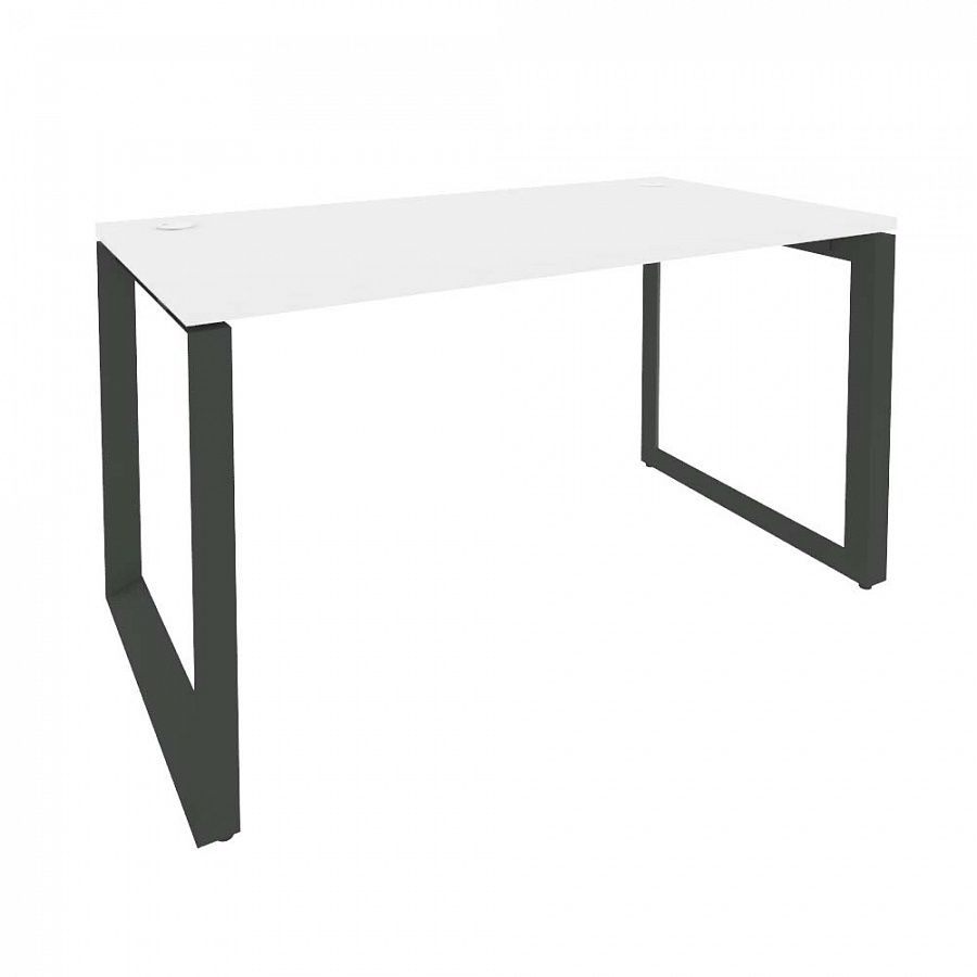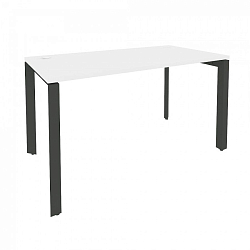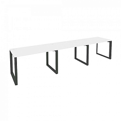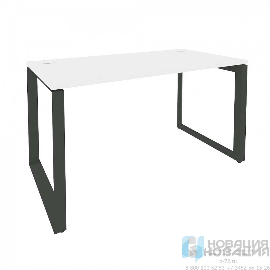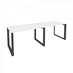 Прямоугольная столешница офисной мебели поддерживается О-образным каркасом из металла. Пластиковые элементы на опорах из труб дополняются винтами для регулировки под неровности пола. Панель из ЛДСП отделана кромкой.