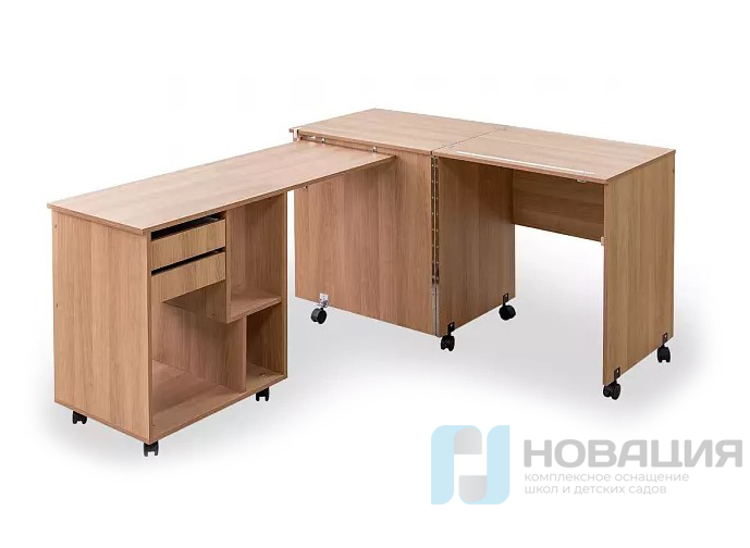 Швейный столик используется в кабинете труда и домоводства, подходит для малогабаритных помещений. Это изделие без дополнительных поверхностей, на которых осуществляется крой. Столик мобильный, с надежными роликами, распашная дверца запирается на ключ.