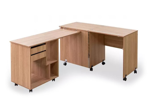 2-местный стол для оверлока и швейной машины представлен в компактном корпусе. Складная конструкция на подвижных опорах легко преобразуется в тумбу, которую можно хранить под столешницей другой мебели, при эксплуатации ставить рядом.