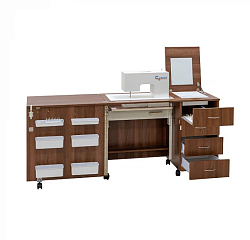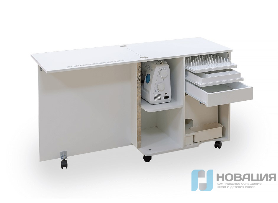 1-местный стол с отсеками для оверлока и швейной машины вписывается в тесные помещения. Компактная мебель используется в кабинете труда и домоводства.