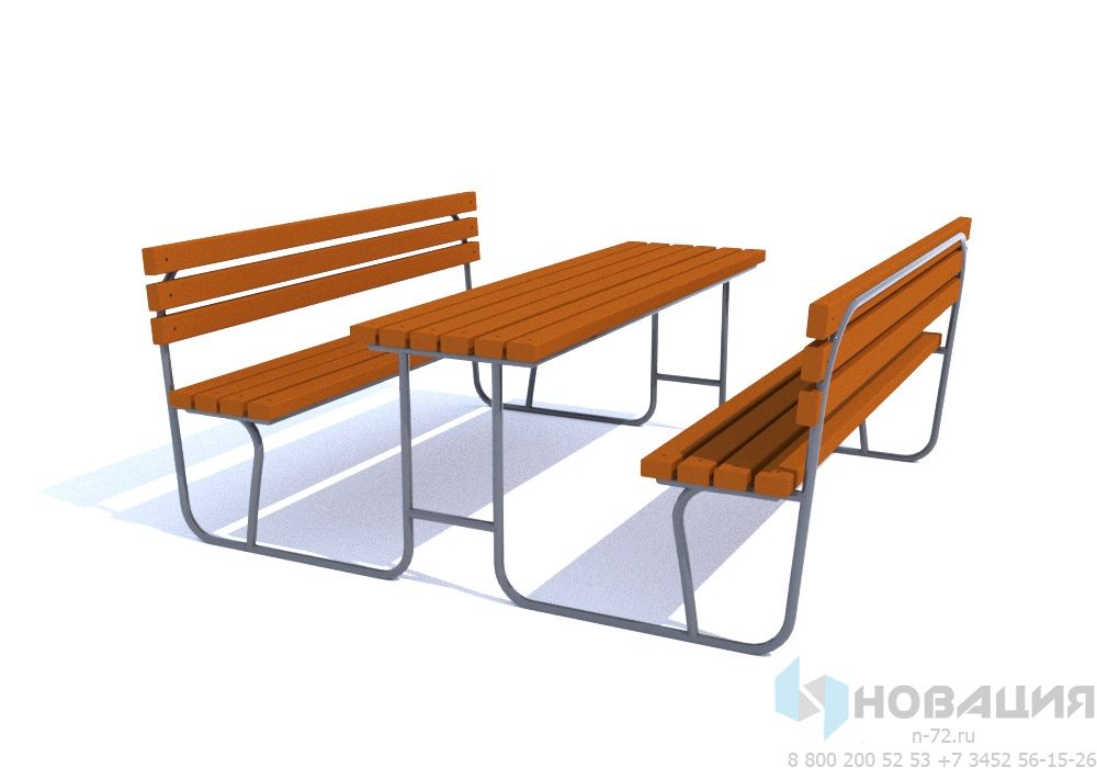 Скамейки представлены прямоугольными сиденьями и спинками на креплениях. Резьбовые соединения закрываются заглушками. Элементы скамьи, как и столешница, изготовлены из отшлифованных сосновых досок.