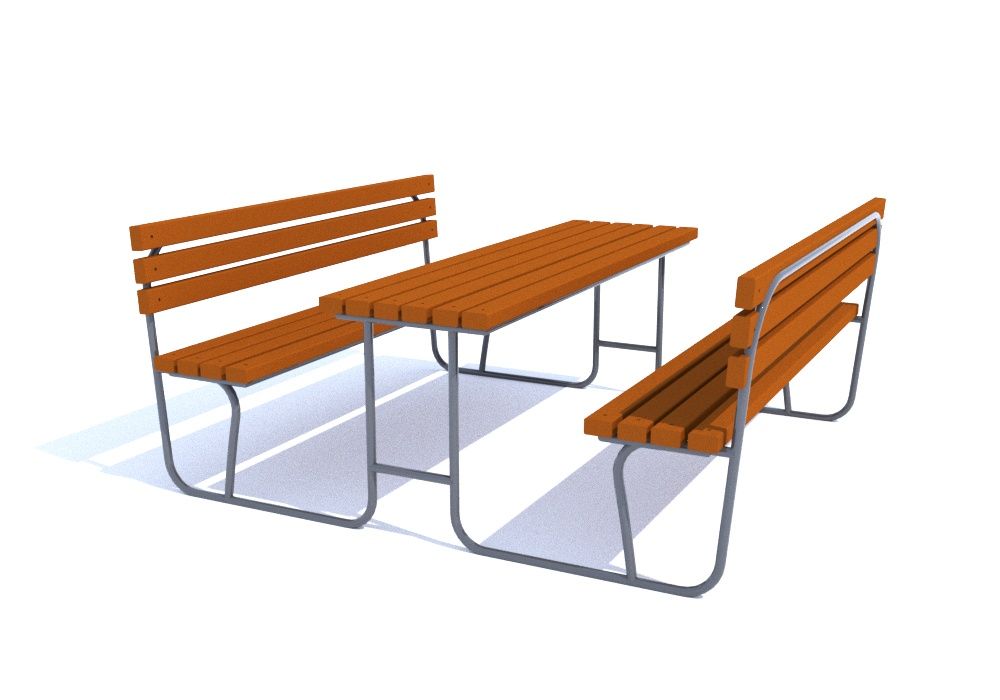 2 скамьи и столик закрепляются на едином каркасе из металла.
