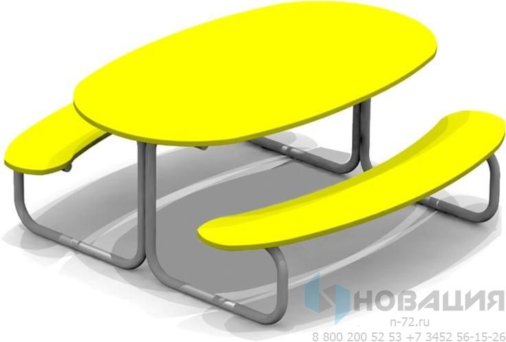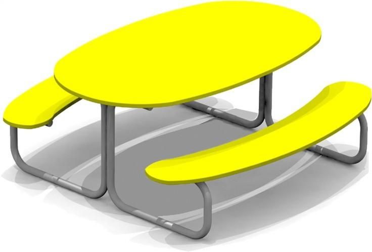 Стол и сиденья овальной формы закрепляются на едином металлическом каркасе. Трубы круглого сечения не имеют острых углов. Металл гальванизируют для укрепления поверхности.