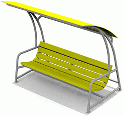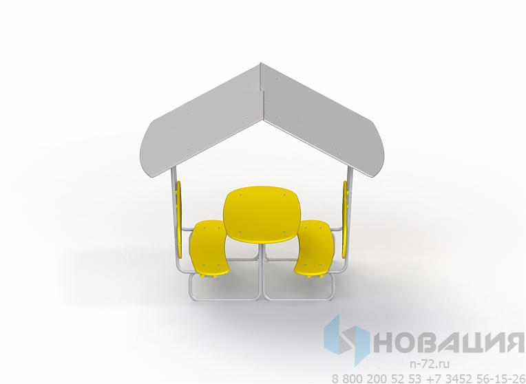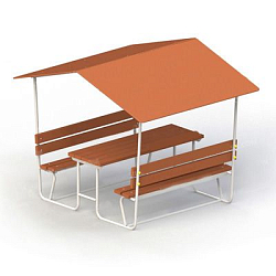Конструкция включает в себя: металлический каркас, 2 скамьи, столик, навес.