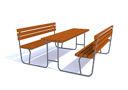 Овальная столешница устанавливается на крепления между скамьями. Каждая скамья представлена овальным сиденьем и спинкой в форме полумесяца. Фанерные элементы отличаются повышенной водостойкостью, избавлены от естественных дефектов.