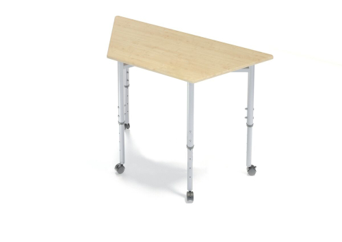 Парта на телескопических опорах меняет высоту. С помощью колес легко передвигается. 6 таких столов можно соединить в шестиугольник с нишей по центру.