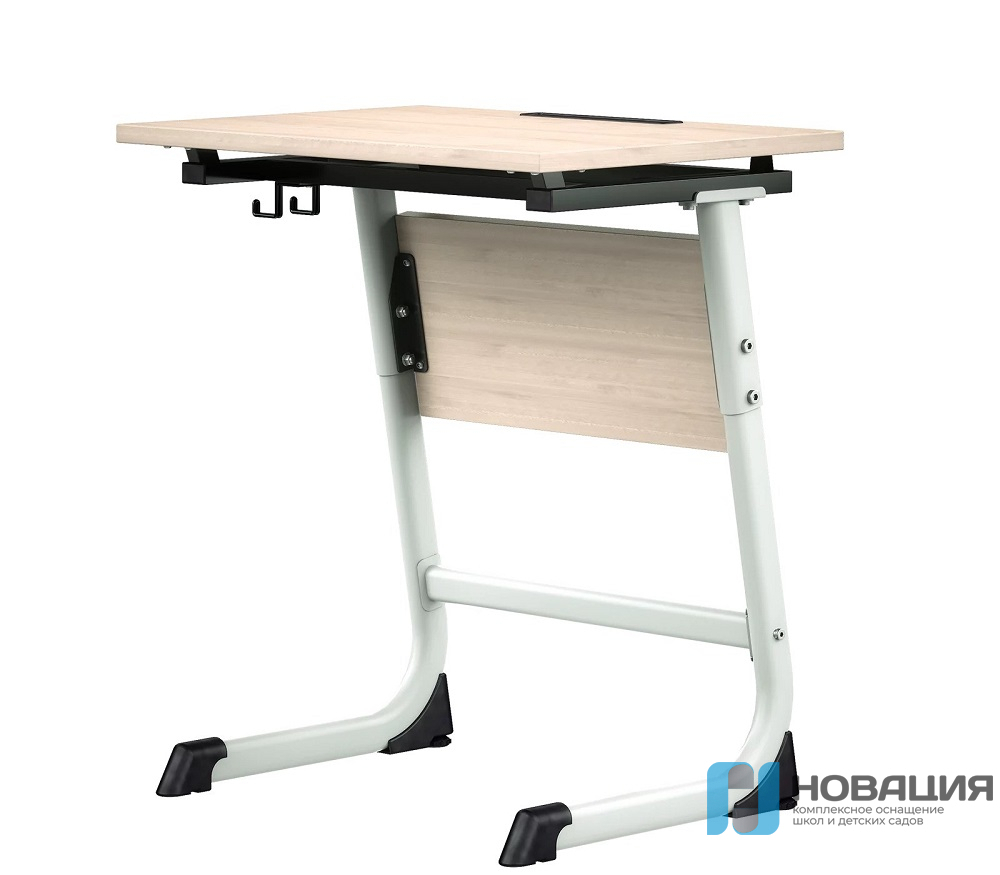 Одноместный стол с изменяемой высотой соответствует СанПиН. Каркас выполнен из плоскоовальной трубы. 2 ножки переходят в полозья с травмобезопасными наконечниками. Неровности пола компенсируются подпятниками. Опоры дополнены перекладиной. Угол наклона столешницы меняется от 0 до 35 градусов дискретно с небольшим шагом (10 положений).
