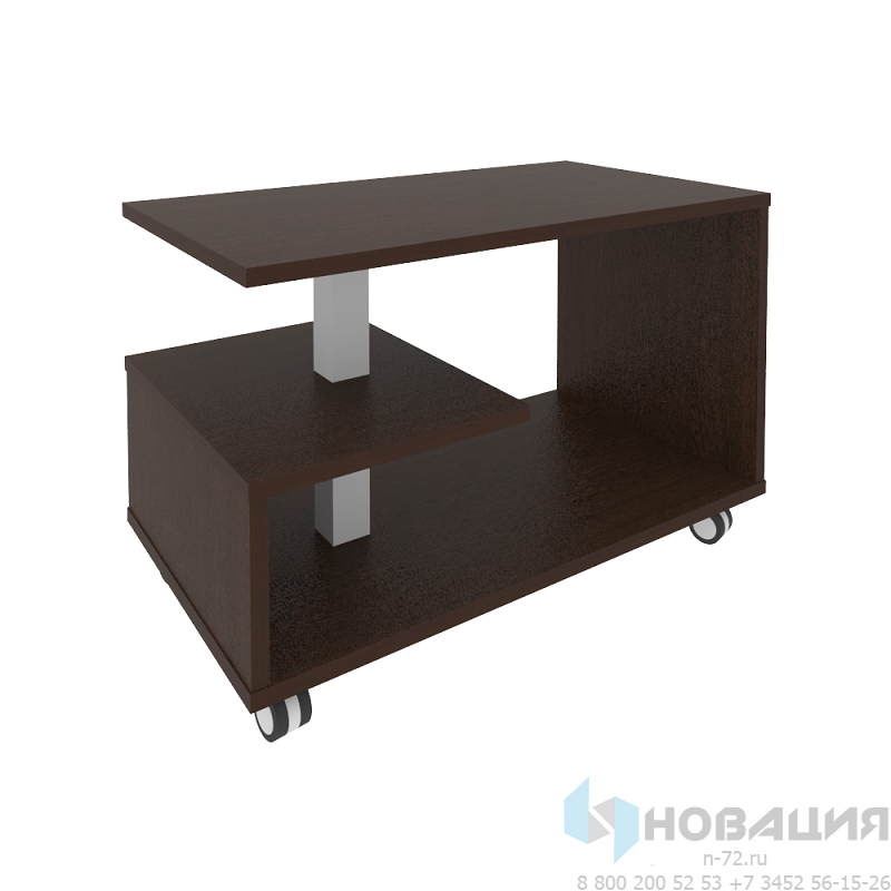 Журнальный столик на 4-х колесах радует нетривиальным дизайном. Под прямоугольной столешницей полуоткрытая полка и вместительный асимметричный отсек. Вертикальная стойка из трубы прямоугольного сечения проходит через полку и отделение. ЛДСП отделана кромкой (0,4 и 2 мм) в цвет мебели. Колеса позволяют перемещать конструкцию вместе с содержимым.