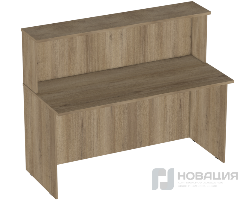 Стойка администратора с надставкой и кабель-каналом на прямоугольной столешнице позволяет установить стационарный ПК, а также хранить необходимую литературу. Такая вместительная и прочная мебель хорошо подходит для оснащения читальных залов, библиотек. Боковые экраны стойки выполняют функцию сплошных деревянных опор.