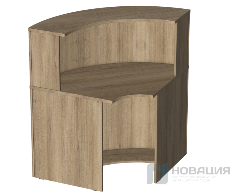 Стойка ресепшн с надставкой на столешнице и кабель-каналом позволяет разместить стационарный ПК или хранить книги, журналы, картотеку. Такая прочная и устойчивая кафедра отлично подходит для оснащения читальных залов, библиотек. Конструкция стоит на двух сплошных деревянных опорах, которые представляют собой расположенные под углом боковые экраны.