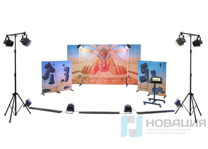 Готовый комплект сценического оборудования укомплектован дополнительными декорациями по теме популярных сказок. Имеет аудиоколонку мощностью 90 Вт для качественного воспроизведения звукового сопровождения спектаклей.