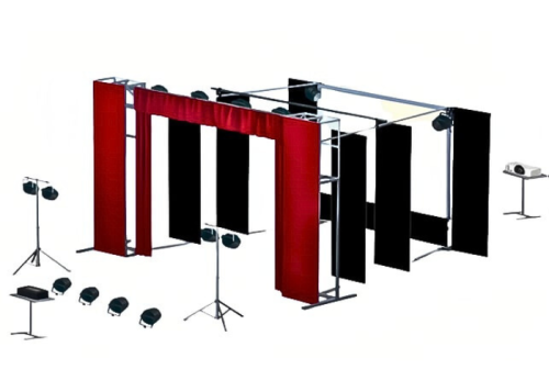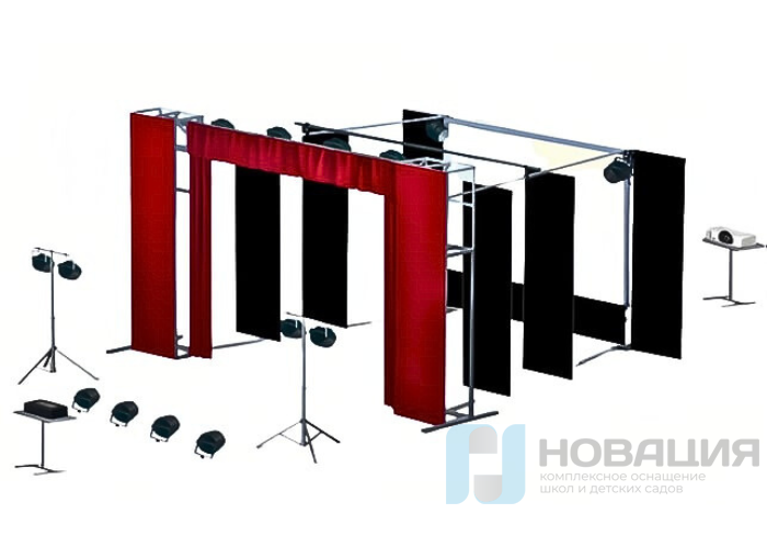 Комплекс полностью оборудован всем необходимым для проведения театральных постановок. Сбора, регулировка и использование комплекса не требует специальных навыков. Камерная сцена укомплектована занавесом с плотностью ткани 250 г/кв.м и шитыми противопожарными нитями. Свет, звук и видео сопровождение одновременно управляются с помощью сенсорного пульта. Короткофокусный проект имеет высокое качество изображения (Full HD).