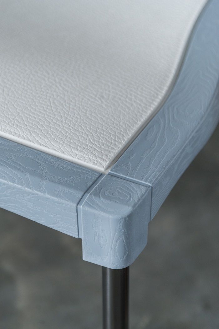 Конструкция представляет собой двухцветный каркас из прочного полипропилена, установленный на ножки из анодированного алюминия. Торцы ножек оснащены износостойкими полиуретановыми заглушками. Они не повреждают напольные покрытия и не скользят.