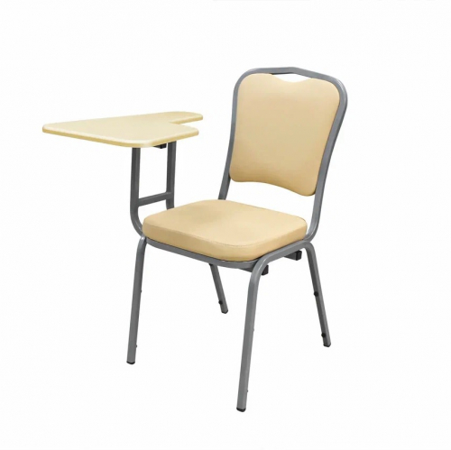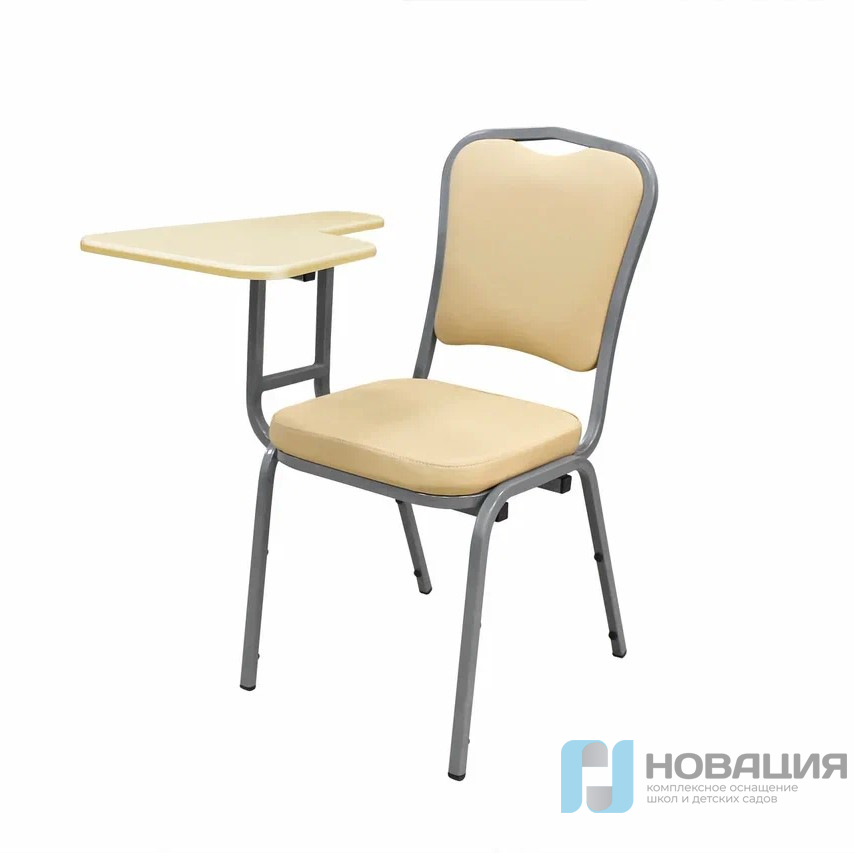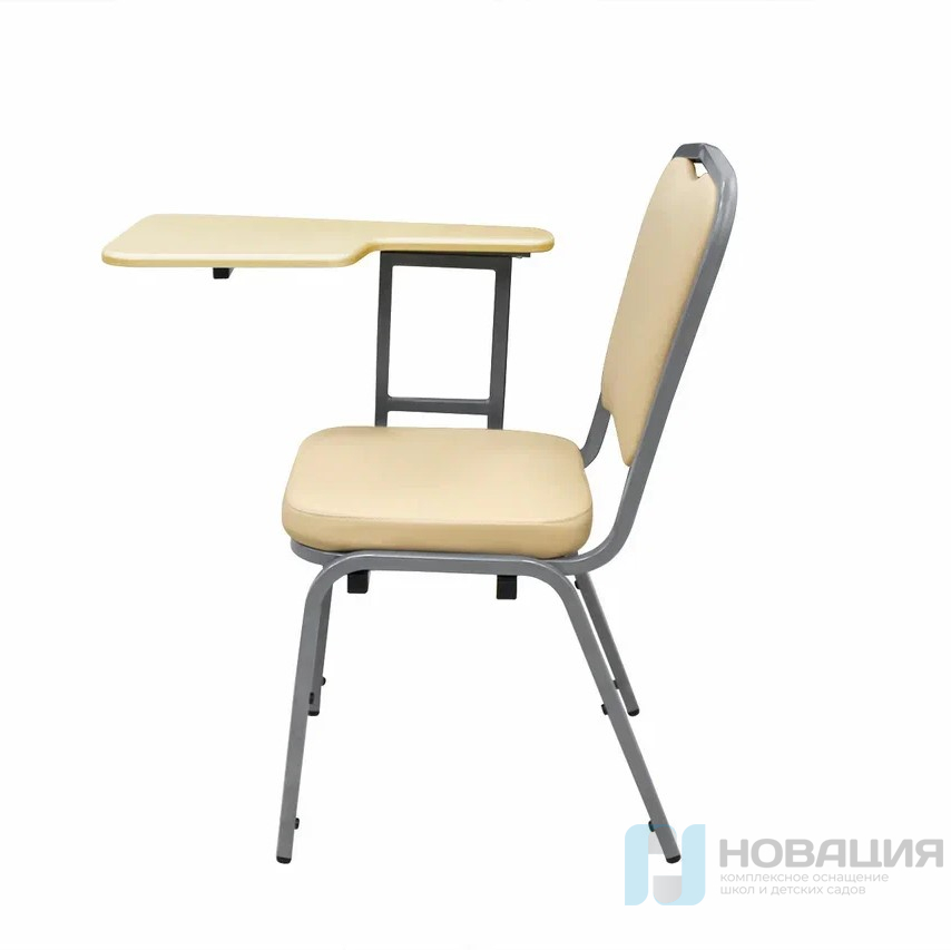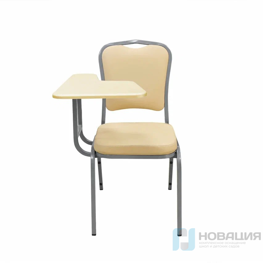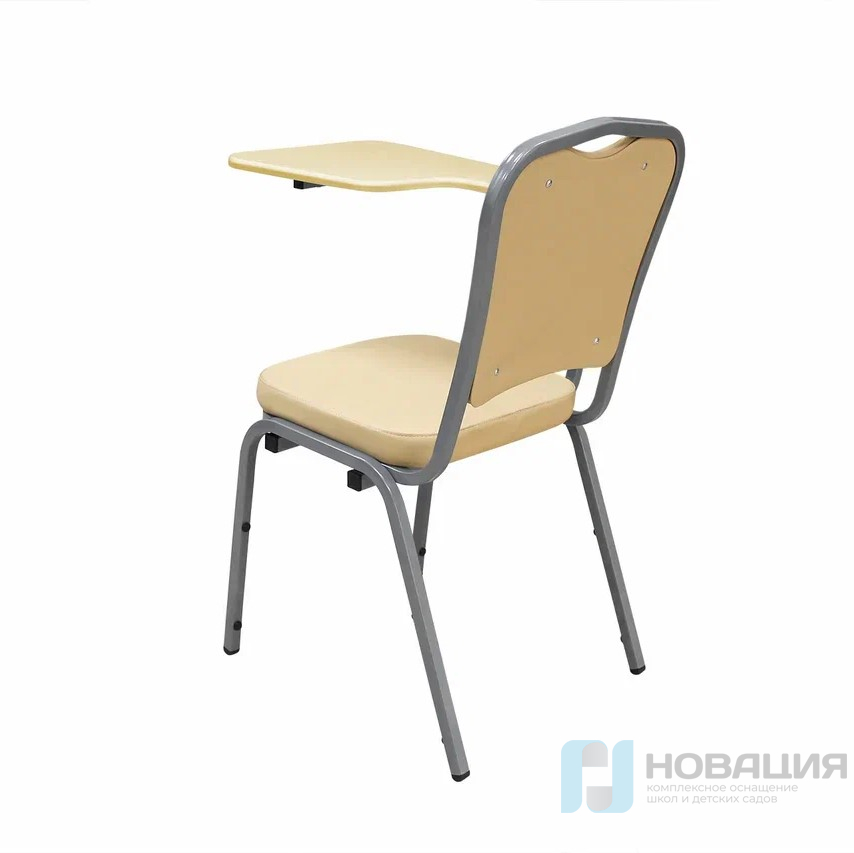 Стул без подлокотников оснащен высоким пюпитром без острых углов, который позволяет делать записи. Размещается на 4-х прочных стальных опорах, на концах которых есть заглушки. Толщина сиденья - 50 мм - обеспечивает дополнительный комфорт. Стул оснащен спинкой размером 350х350 мм.