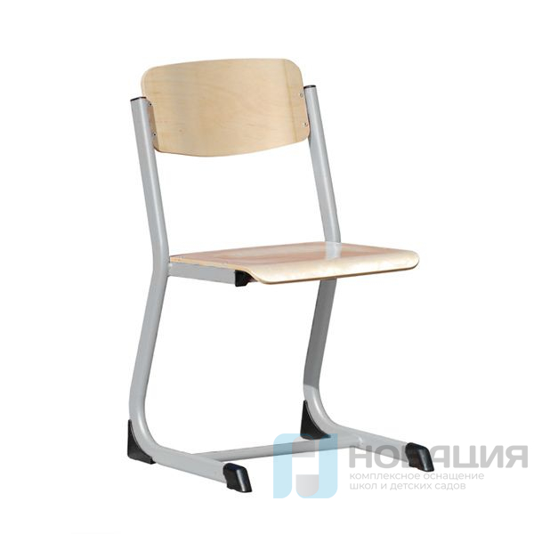 Ученический стул на опорах-полозьях оснащен квадратным сиденьем (ДхШ 380х380 мм) и эргономичной спинкой. При производстве учтены требования СанПиН: поддерживается средняя часть позвоночника, нет нагрузки на поясничный отдел. Передний край сиденья закруглен. Опоры-полозья с подпятниками и заглушками соединяются перекладиной. Углы наклона сиденья и спинки 3° и 100° соответственно.