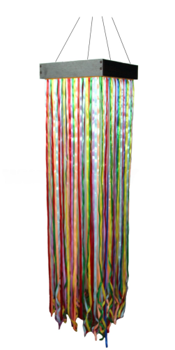 Основу оборудования для сенсорной комнаты составляет деревянный каркас с креплением к потолку. На внутренней поверхности каркаса - безопасное пластиковое зеркало. К внешней стороне прикреплены разноцветные ленты, формирующие "шатер". Контакт с мягкими лентами развивает тактильное восприятие.